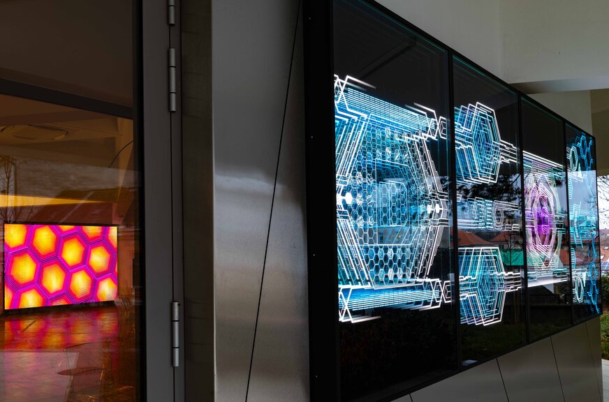 Az elsődleges az volt, ami mellett nem lehetett értelemszerűen elmenni, az az épület speciális formaisága; hexagon forma nagyon tetszett nekünk. Itt úgy gondoltuk, hogy tisztelni kell az épületet, kell hozzá igazodjunk, megfelelő érzékenységgel kell hozzáállnunk egy látvány, kompozíció megalkotásának, ezért nem volt kérdés, hogy a munkánk is zömmel hexagonokból fog összeállni, mint ahogy arra már jóval korábban volt egy példánk, még a munkásságunk elején.