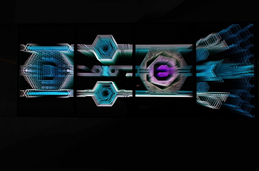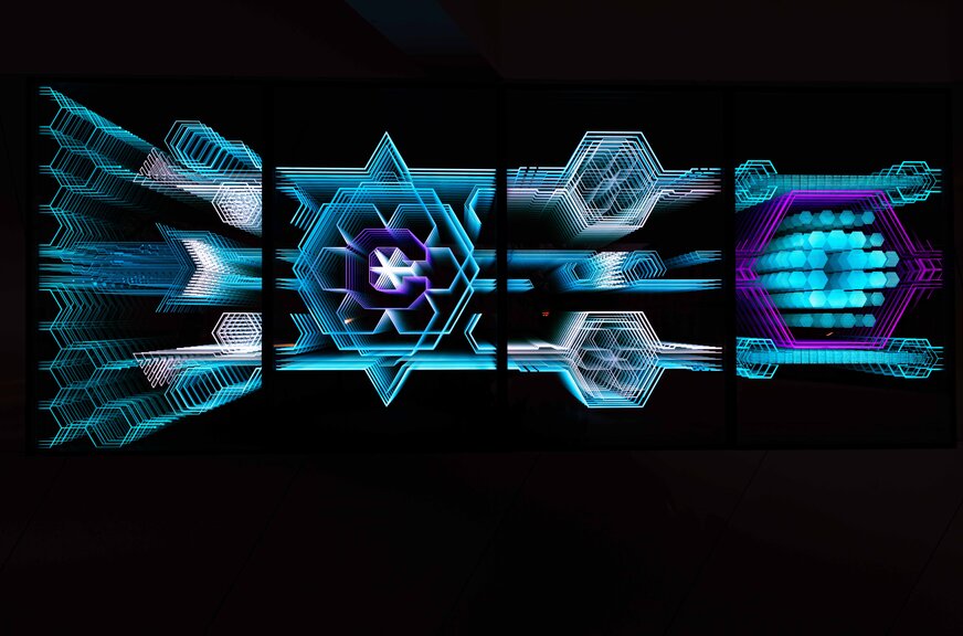 Amit még szerettünk volna mindenképp megjeleníteni a munkában, az az épület új funkciója szerinti vezérgondolatok megjelenítése. Már korábban is volt példa rá, 1-1 munkánknál, hogy kódoltunk 2-es számrendszerben bizonyos üzeneteket, ezt itt most azzal bonyolítottuk, hogy 0, és 1 számjegyek helyett üres és teli hexagonokat használtunk a kódoláshoz. Maga a kódolás, mint számítógépes nyelv az épület digitális élményközpont voltához, és a digitális fényművészethez ilyen módon is kapcsolódik, de az üzenetek is kapcsolódnak az új funkcióhoz.